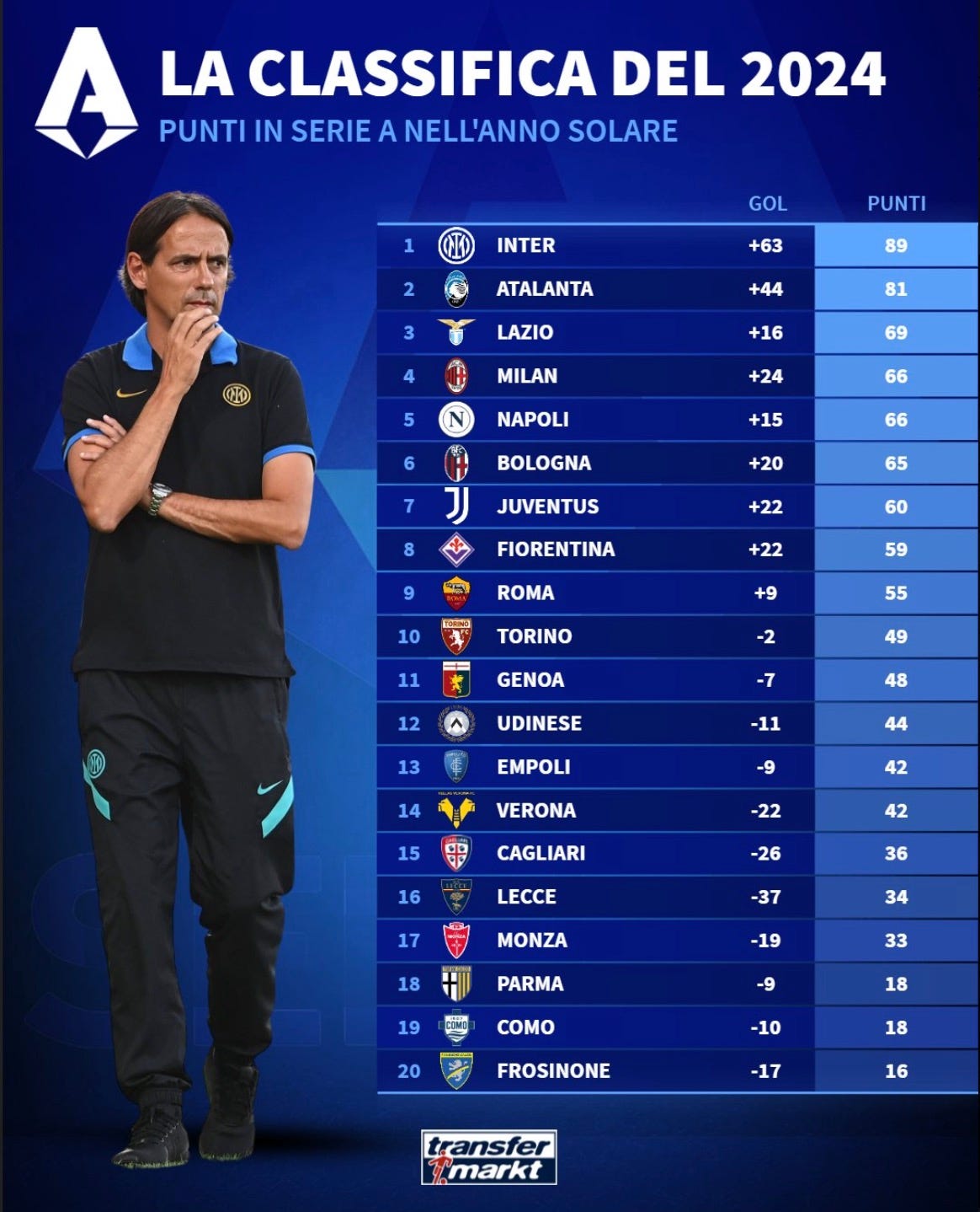 The folks at Transfermarkt have put together a ‘league table’ for the calendar year of 2024, which, perhaps unsurprisingly, shows that reigning champions Inter and current leaders Atalanta accrued the most points.